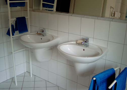 Im Vollbad und in den Zimmern gibt es ausreichend Manövrierraum. Die Betten in beiden Zimmern sind erhöht.