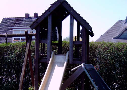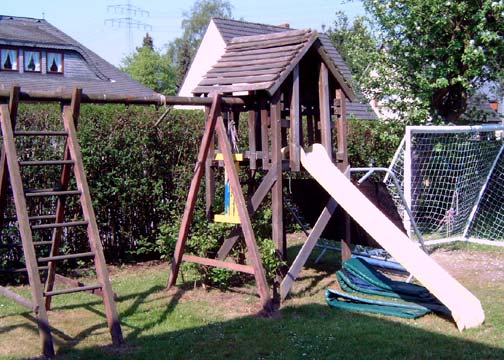Ein großer Garten mit mehreren riesigen Trampolinen und Klettergerüst mit Rutsche und Schaukel lässt jedes Kinderherz höher schlagen.